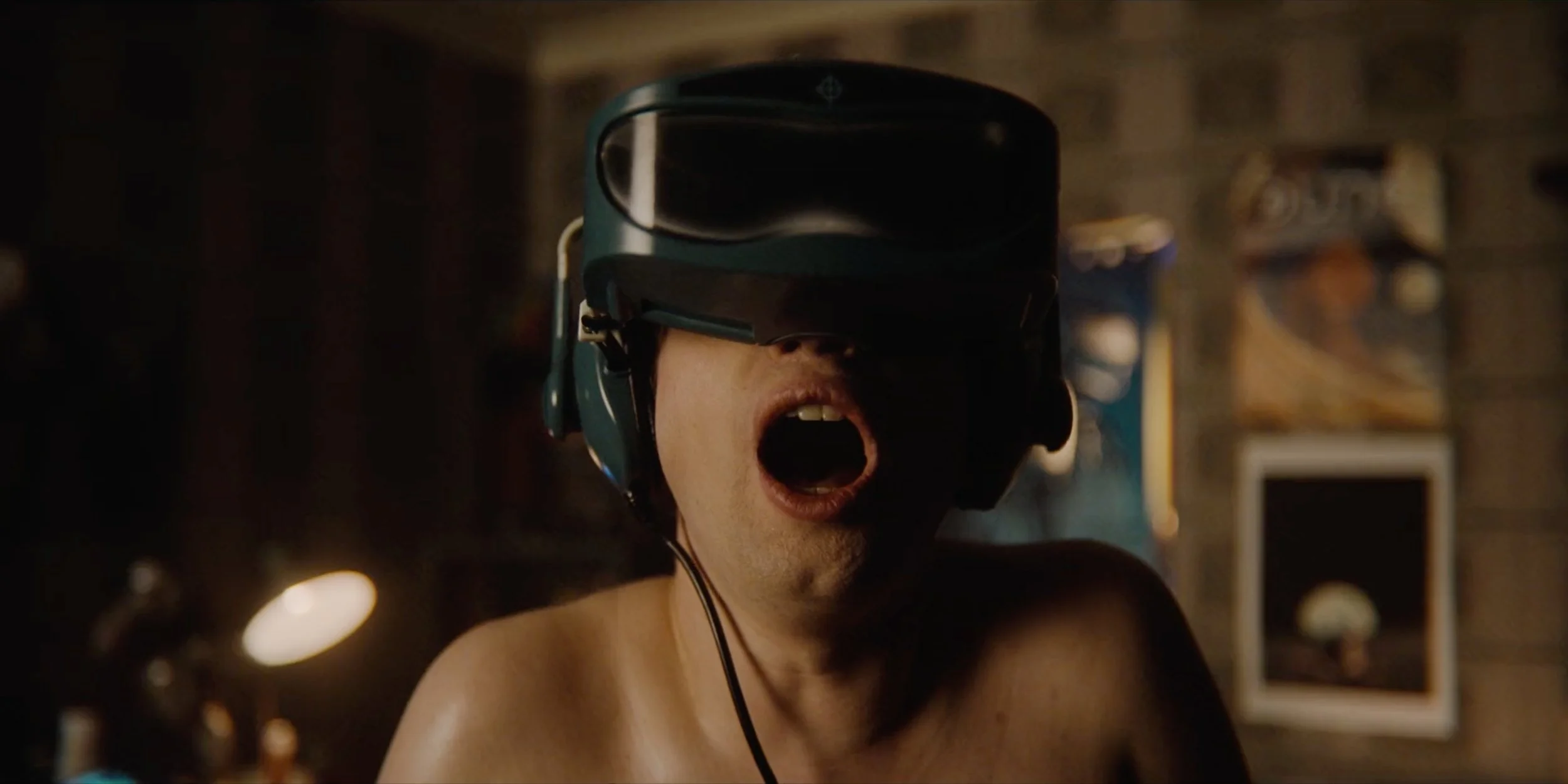 We reveal Clifton alone in a trashed room hooked up to a military grade VR headset. Tissue boxes and PB&J sandwiches line the room collecting flies. We intercut between Clifton in his fantasy world and his cage of delusion.