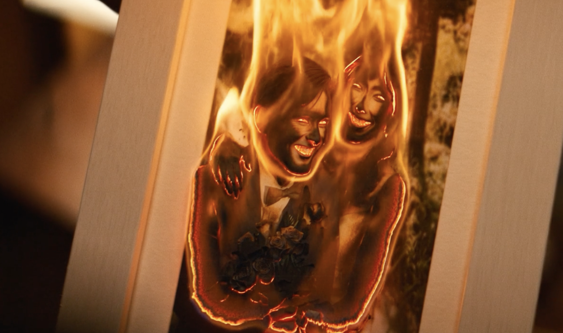 Trippy shots of a women swallowing his wedding ring, another woman burning the photo of his wife, green cables from the album art growing on his eyeballs Any resemblance of his identity is washed away.